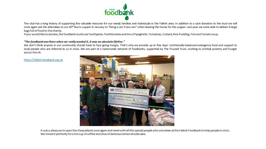 This year we are asking all guests if they would consider bringing something for the Fakirk Food Bank. We will collect donations on the evening and deliver them to the foodbank next day.